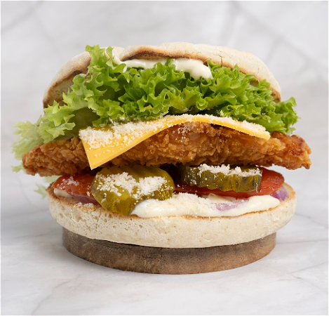 Een luxe smaakbeleving met knapperige kip, romige truffelmayonaise en rijkelijk geraspte Parmezaanse kaas. Belegd met tomaat, augurk, ui en lollo rosso sla